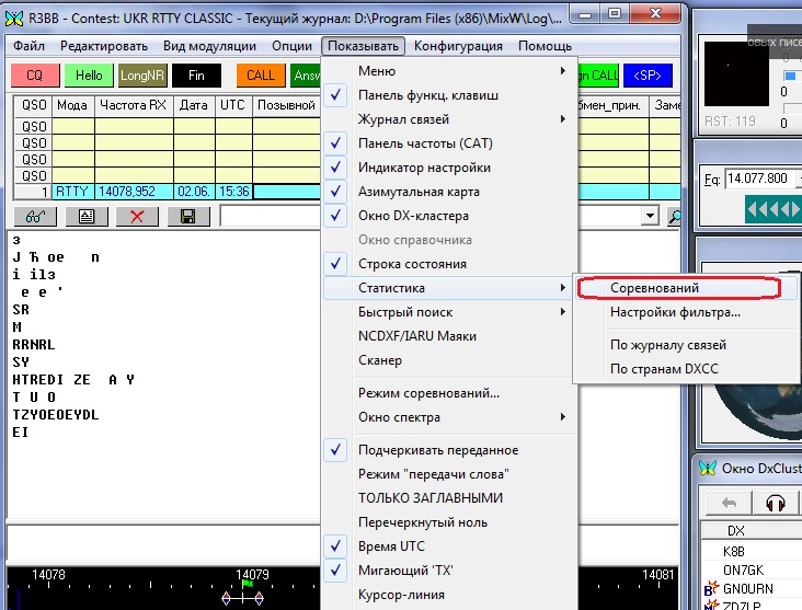 Для активирования теста - мышкой кликнуть на UKR RTTY CLASSIC нажать Выбрать и Закрыть или кликнуть двойным кликом на UKR RTTY CLASSIC. Появится основное окно MixW (Рис.9) Для отображения статистики нажать Показывать -> Статистика->Соревнований.